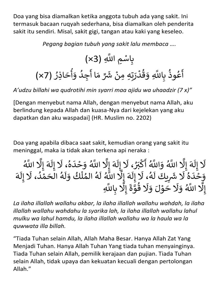 Rasulullah saw melakukan ini dengan diulangi hingga tiga kali. Pegang bagian tubuh yang sakit lalu membaca …. Pegang bagian tubuh yang sakit lalu membaca …. · بِاسْمِ اللَّهِ (3×) · أَعُوذُ بِاللَّهِ وَقُدْرَتِهِ مِنْ شَرِّ مَا أَجِدُ وَأُحَاذِرُ (7×) · bismillah (3 x) · a' . Atau kita lakukan pada orang lain dengan cara yang sama, yaitu memegang bagian tubuh yang . "ruqyah termasuk bagian dari doa. Bacaan doa ini sangat sederhana dan bisa dipraktikan ketika ada bagian tubuh yang terasa tidak sehat. Melansir dari laman liputan6.com, untuk menyembuhkan bagian tubuh yang sakit, bacalah doa seperti yang dianjurkan oleh rasulullah saw. Doa untuk kesembuhan bagian tubuh yang sakit pantai, kerohanian, allah, membaca, kartu. ㅤ بِاسْمِ اللَّهِ (3×) ㅤ أَعُوذُ بِاللَّهِ . Doa ketika ada bagian tubuh yang sakit. Ilustrasi bacaan doa agar cepat sembuh dari sakit, sumber foto: Misal, sakit gigi, tangan terseliuh, atau kaki yang terseliuh.