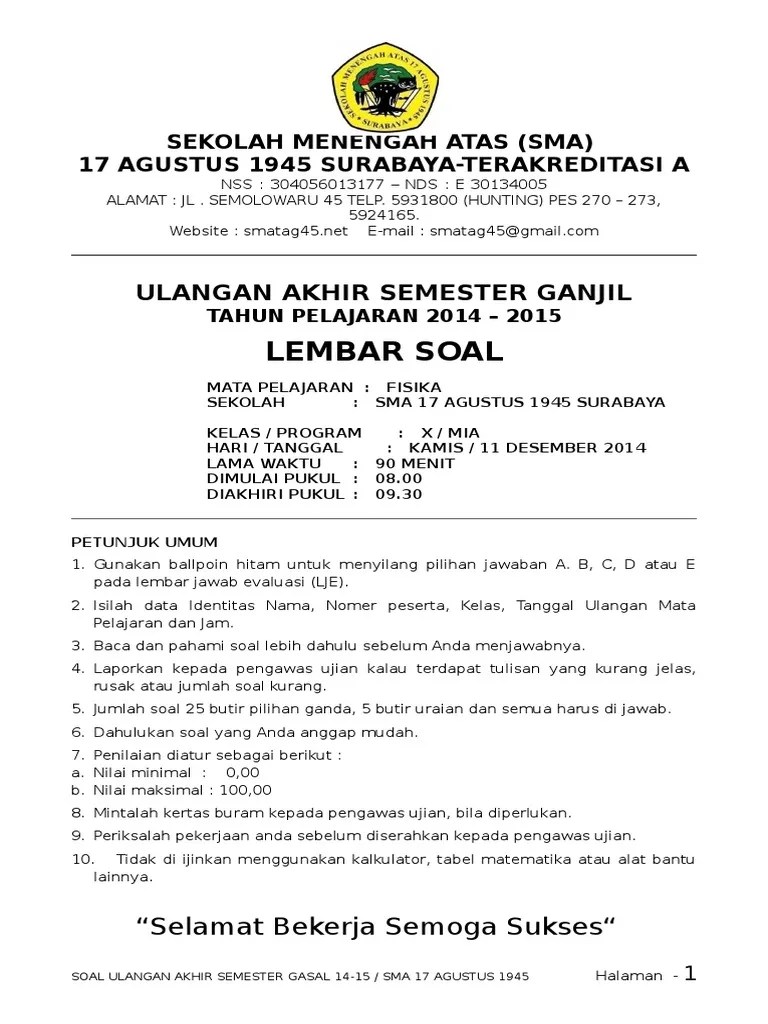 Dengan materi uas fisika kelas 10 . Pembahasan soal fisika kelas x 10 semester 1 dan 2. Berikut ini adalah contoh soal uas (ujian akhir semester) i (gasal) untuk. Contoh soal uas fisika sma smk kelas x xi xii semester 1 2017 2018. Lengkap 35 contoh soal uas fisika kelas 10 sma ma semester genap.
